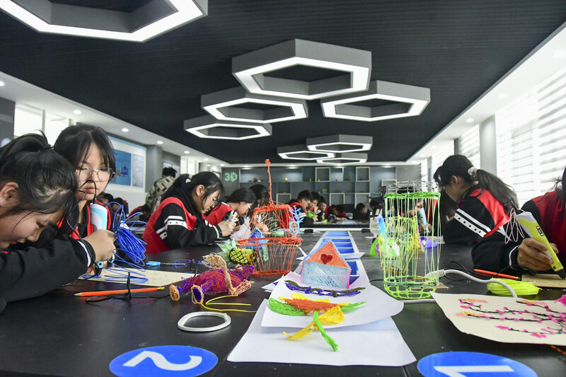 在科技飞速发展的今天,借助3D打印就可以实现这些美好的想象! 在创客实践室里,老师首先向同学们播放相关视频,让大家明白平面与立体的区别,知道什么是3D,并介绍了打印笔的使用方法以及工作原理。? 随后同学们按照老师的指导步骤,开始了动手实践打印的神奇旅行。在同学们的精心、细心、耐心的制作中,一个个奇特漂亮的3D模型诞生啦!看,少年们还发挥自己的想象,制作出了每个人独一无二的作品。