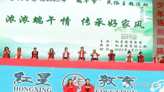 红星教育集团2023年“浓浓端午情 传承好家风“端午节民俗主题活动6月21日下午,由红星教育集团主办,红星幼儿园承办的2023年“浓浓端午情 传承好家风”端午节民俗主题活动,在校体育场拉开帷幕,现场师幼、家长共3000余人齐聚一堂,以端午民俗活动为载体,构建家园共育桥梁,通过民俗游戏活动体验,感受中华传统习俗文化。 宝丰县关心下一代工作委员会执行主任娄文聚,副主任韩富安,副秘书长胡少坡、蔡培叶,县妇联党组书记孙秋宾、县妇联主席武晓丽、县妇联副主席段春红、县融媒体中心副总编梁国强、红星教育集团副董事长陶娜及红星教育集团总部各处室领导、红星幼儿园领导班子参加此次活动。 县关心下一代工作委员会执行主任娄文聚致辞 与会领导登高祈愿 红星教育集团顾问马喜本及家长代表写下“国泰民安”等书法作品,祝福祖国繁荣昌盛、国泰民安!