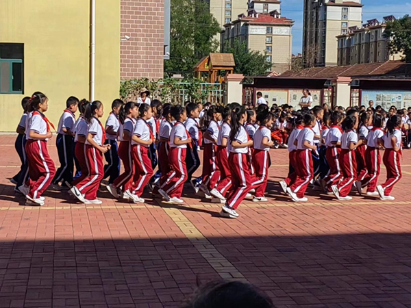 在祖国华诞即将到来之际,为迎接第十九届亚运会,弘扬体育精神,增强学生体质,丰富学生的文体生活,烟台市牟平区新建街小学举行了“迎亚运 展风采”队列体能操比赛向国庆献礼。
