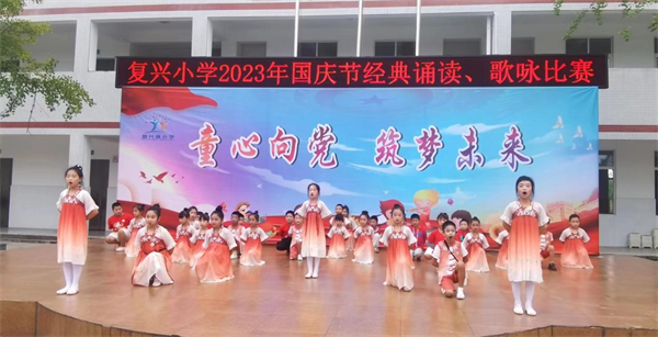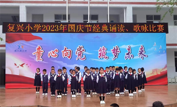 “童心向党 筑梦起航”——复兴小学2023年庆国庆经典诵读、歌咏比赛有一面旗帜叫五星红旗,高高飘扬熠熠生辉;有一种深情的表白,是“我爱你,中国”。为庆祝祖国母亲74岁华诞,眉山市东坡区复兴镇小学于9月28日上午,开展了“童心向党 筑梦起航”经典诵读、歌咏比赛。