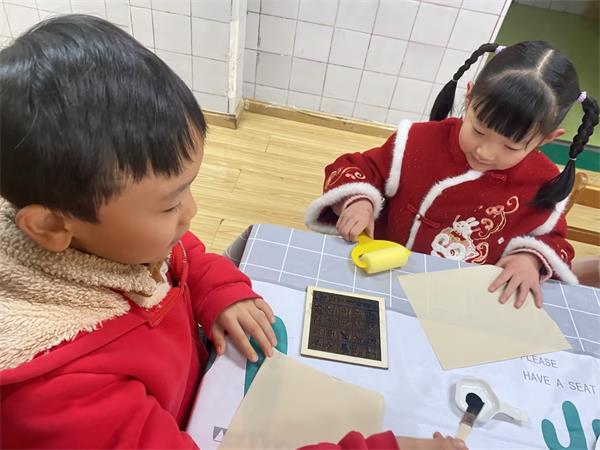 乐游——非遗传承迎新年 中国非物质文化遗产是中华文化的瑰宝。孩子们在老师的带领下了解非遗,走进非遗:古法造纸、活字印刷、创意扎染、绘泥、剪纸……这些传统手艺激发了幼儿对传统文化的兴趣与热爱。