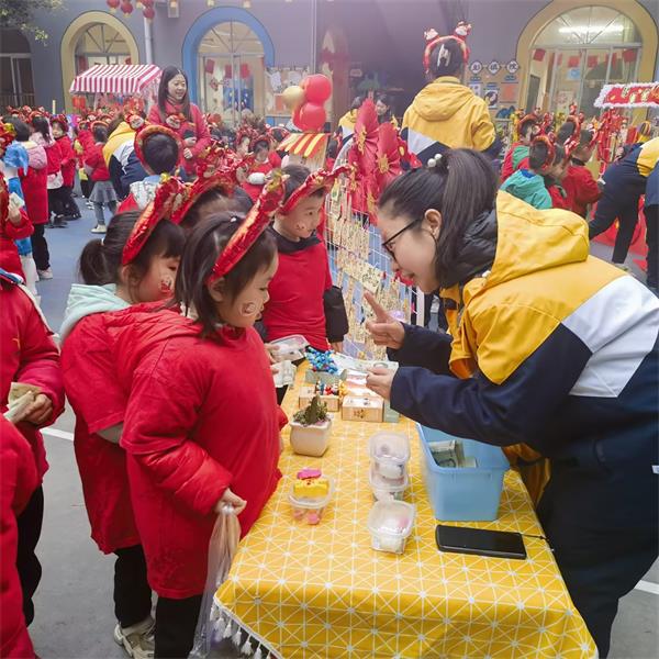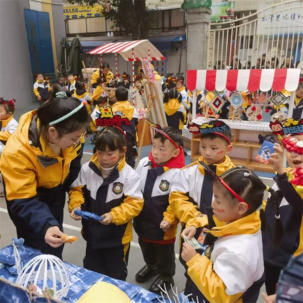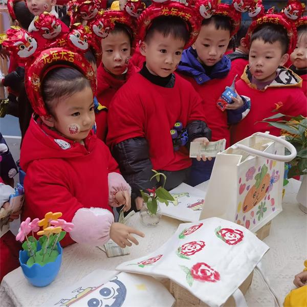 义卖活动现场,创意扎染、串珠饰品、惊喜盲盒、编织、刺绣、创意环保袋、沙画、积木扭扭棒、滴胶钥匙扣手工作品、自制香水、玩具乐园、魔法套圈等10多个摊位一字排开,幼儿园俨然成了一个小小的跳蚤市场。小买家们愉快地行走在各个摊位,在心仪的售卖区选择自己喜欢的物品;各位小小售货员们则认真地介绍价格,并对自己摊位的物品不停地进行讲解、售卖。