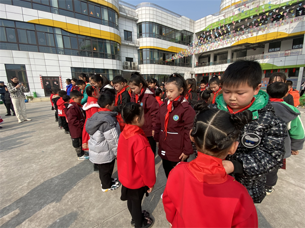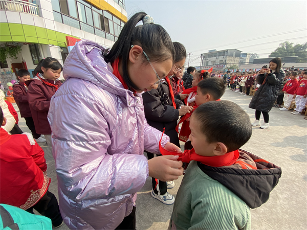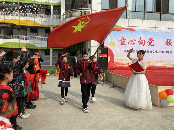 有一种颜色,飘扬在心中永不褪色;有一种光荣,是成为中国少年先锋队队员;有一种骄傲,令同学们激动不已——那就是戴上鲜艳的红领巾。文艺汇演开始之前,少先队举行了庄严的新队员入队仪式,有36名一年级新生从今日起正式成为了光荣的少先队员。准备加入少先队的新同学们面带笑容,怀揣着欣喜与激动站定,在铿锵激昂的出旗曲中,鲜艳夺目的队旗进入主席台,旗手们步伐坚定有力缓缓前行,仪式开始时少先队大队辅导员刘旭老师宣布了入队新生名单,接着由高年级老队员郑重地为新队员戴上了红领巾,他们稚嫩的小脸在红领巾的映衬下更显朝气蓬勃。随后队员们一起郑重宣誓,鲜艳的红领巾飘扬在胸前。