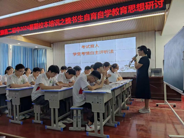 近两年以来,社旗县中等职业学校自育自学研究室通过问卷调查、座谈交流等多种形式对学情、考情进行全面调研,通过课题性论证,专题性教研等活动,通过实验教师、实验班,先点后面的实践探索,形成了比较系统、完善的考试育人学生考情自主评析法。李永敬书记所撰写的论文《用好评价指挥棒 撬动教育高质量发展》和《考试怎样体现育人功能》分别发表在2023年12月20日出版的《德育报》和2024年1月24日出版的《中国教师报》上,“考试育人学生考情自主评析法”的理念更是受到广泛关注。为了让更多的师生分享这一成果,课题组开展“考试育人走进名校”活动,其宗旨是“走进名校,学术交流,服务学校,助力学生”。 在社旗县第二初级中学全体教师校本培训会上,通过三个环节与全校师生及部分外校教师分享了“学生考情自主评析法”。 第一环节:由秦远晴老师首先提出三个教育教学过程中不可回避的问题,让与会的师生进行思考。一是作为一名教师,你认为考试的功能是什么?二是作为一名教师,你认为影响考试成绩的因素是什么?三是作为一名教师,你将从哪些方面对考试进行分析和评价?针对以上问题,在老师们讨论、思考的基础上,秦老师随机与三位老师互动交流,以此引发老师们对“学生考情自主评析法”的兴趣和关注。 第二环节:由我校卢新萍老师给30位初二学生上“学生考情自主评法”观摩课。通过师生互动、小组讨论和个人展示,让师生初步感知“学生考情自主评析法”的内容;初步掌握“学生考情自主评析”的操作流程和使用方法;让师生初步感受“学生考情自主评析过程中的快乐。” 第三环节:由李永敬书记作“考试育人学生考情自主评析法”的解读报告。从“考试育人学生考情自主评析”产生的背景、理论依据、实践探讨、取得成效和未来展望等几个方面作系统、全面、深刻的解读,对具体内容、操作流程和注意事项作了详细具体的说明,对这种方法“眼前意义重大,有利于学生修炼心性,提分升学;长远价值深远,有利于学生终身发展”的教育价值进行了科学的阐述。 一张试卷,不再仅仅让学生看看分数,是让学生对学习方法、习惯养成、价值理念和理想信念等方面的全方位检验。 一张试卷,不再仅仅是让学生知道对错,而是让学生引发思考,全方位,有深度地思考。 一张试卷,不再是知识点掌握程度的检验,是让学生学会透过现象看本质的训练。 一张试卷,不再是改正错误的过程,而是让学生学会解决问题能力的训练。 一张试卷,不再是各种问题困难的集合,而是让学生面对困难,积极寻求克服困难的方法,让困难和问题成为学生成长的台阶。 ……… 学生考情自主评析法,是一种方法,是一个工具,是一个手段! 通过此次培训,在师生中产生了强烈共鸣,师生们纷纷表示,“学生考情自主评析法“,让我们对考试功能有了更全面的认识,学会了比较系统的试卷评析法,形成了发现问题、分析问题、解决问题的思想方法,为今后学生个人成长、教师专业发展和教育教学质量给予了助力。(李小伟)