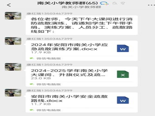 安阳市南关小学开展消防应急疏散演练时间:2024-09-30 校园安全重于泰山,为提升师生的安全意识,强化学生应对意外的安全逃生技能,提高学校的应急处置能力,筑牢校园安全防线,2024年9月29日下午,安阳市南关小学开展了消防应急疏散演练。 演练部署 为了保障师生在火灾来临时能快速、有序、安全、高效地疏散,校领导作了精密细致的工作安排,并制订了详细的方案,进行人员分工,细化疏散演练细节,注明各班疏散路线以及在演练过程中的注意事项,为本次演练做好充足的准备。 实战演练 随着演练哨声响起,消防演练正式开始。 同学们在老师的引导下弯腰、低头、捂住口鼻,按规定好的逃生路线,排成一列列纵队,迅速有序地撤离到安全集合地点。 整个过程历时1分45秒,全校师生全部撤离到安全位置后,各班立即清点人数并逐级汇报撤离情况。 总结反思,安全常伴 演练结束后,王磊老师对此次活动进行总结,他指出,每一次消防演练都是对全校师生安全意识和应急反应能力的考验,演练中老师们有效引导学生们有序、迅速地撤离,高效完成了本次演练,达到了演练的目的。 同时他也强调了消防安全的重要性,提醒全体师生时刻保持消防安全意识,掌握基本的逃生技能,确保自身生命安全。 此次消防应急疏散演练活动,增强了师生们对火灾的警觉性和应急处理能力,为校园消防安全工作打下坚实的基础,做到防患于未然,为全校师生筑起了一道坚固的消防安全防线!