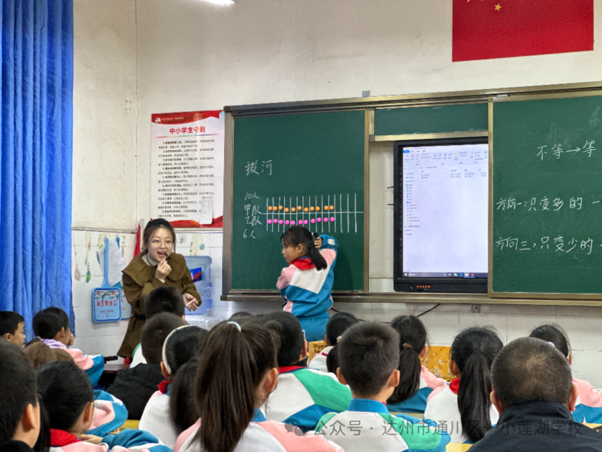 刘于靖老师执教三年级上册《等与不等》。刘老师在孩子已有的知识基础上,让学生从多个角度探究让不等变等的方法,给予孩子充分展示的机会,经过多次比较和操作体会方法的无限性。整节课活泼有趣,学生们在课堂上积极思考、踊跃发言,充分展示了对数学的强烈求知欲。