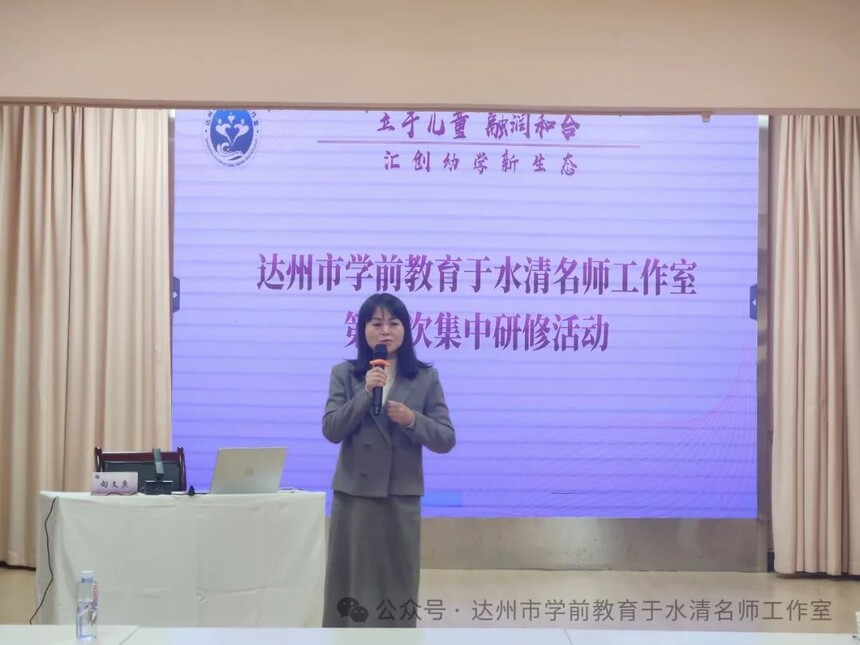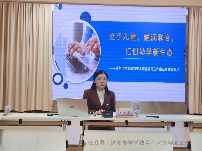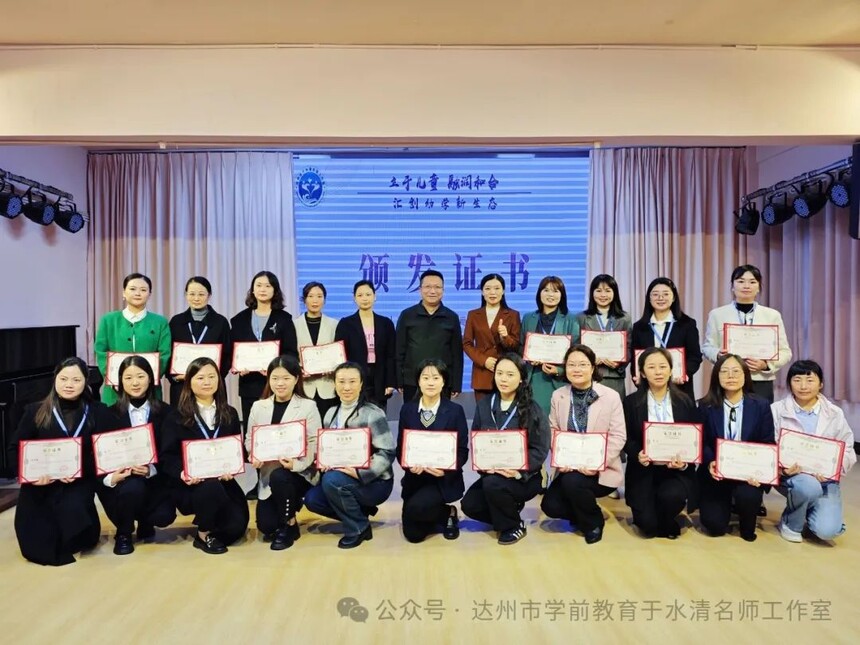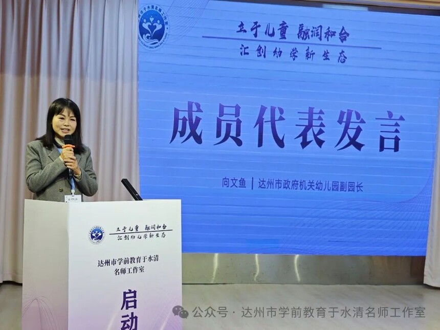 研精覃思 集智赋能——达州市学前教育于水清名师工作室启动仪式暨第一次研修活动水尝无华,相荡乃成涟漪;石本无火,相击而发灵光。为贯彻落实达州市第二批“三名”工作室建设文件精神,充分发挥名师工作室示范引领和辐射带动作用,实现优质教育资源协同共享,大力推进学前教育高质量发展,2024年11月14日,达州市学前教育于水清名师工作室启动仪式暨第一次研修活动在达川区实验幼儿园隆重举行。本次活动由达川区实验幼儿园副园长魏雪主持。 重庆师范大学副教授、教育学博士、硕士研究生导师、学前教育系主任蔡红梅,达州市教育局人事科副科长卢青松,达川区教育局党组成员、机关党委书记易仕健,通川区教师进修学校副校长牟必芳,达川区教育局基础教育股负责人林莉,达川区教育局政工人事股负责人曾飞出席活动。四川省于水清卓越园长工作室、达州市学前教育于水清名师工作室、达川区于水清名园长工作室、达川区学前教育名师工作室成员及学员等40余人参与此次活动。 在实幼副园长赵艳艳和张微、周倪萍老师的引领下,与会人员看见了实幼科研兴园的良好态势,目睹了“和雅”校园文化有效融入幼儿一日生活中的多元教育样态,沉浸到班级见证了孩子们丰富多彩的活动,实地观摩了“搭来搭去”“木工坊”等自主游戏,赏析了传统工艺与现代元素相结合的创意扎染作品,近距离感受到幼儿园童趣的教育环境、充实的教育内涵、精细的园所管理以及孩子们阳光的个性品质。 在全体与会人员的期盼与掌声中,启动仪式正式拉开了帷幕。达州市教育局人事科副科长卢青松同志宣读达州市学前教育于水清名师工作室成立文件及成员名单。 达川区教育局党组成员、机关党委书记易仕健为工作室授牌,授予的是荣誉,接受的是担当。金灿灿的匾牌熠熠生辉,预示着工作室将肩负起教育引领的重任,聚光成炬、携手同行。 以证书为载体,递交出厚重责任与殷切期待。达川区教育局党组成员、机关党委书记易仕健同志为指导专家团队及工作室顾问颁发聘书,达川区教育局基础教育股负责人林莉、达川区教育局政工人事股负责人曾飞为工作室成员颁发证书。 守初心,担使命。达州市政府机关幼儿园副园长向文鱼作为工作室成员代表进行发言。她表示,将以名师工作室为新的起点,主动承担各项研修任务,积极创新教育思路,努力提升自我,与工作室成员一起集结微光,燎原前行。 领衔人于水清园长以“研精覃思 集智赋能”作了启航宣言,她表示,名师工作室将秉承“立于儿童,融润和合,汇创幼学新生态”的发展理念,带领工作室成员推动《学前教育法》落地落实,不断践行教育家精神,守正创新,行远自迩,争做孩子为学、为事、为人的“大先生”。立足教学实际,聚焦课程游戏化,着力打造一支师德高尚、理论扎实、业务精湛、具有强烈发展意识和实践能力的名师团队,以教师的专业成长作为核心竞争力带动达州市学前教育高质量发展。 达川区教育局党组成员、机关党委书记易仕健对工作室的成立表示热烈祝贺并提出四点希望,一要明确目标定位,努力打造为学前教育研究的智囊团,教师成长的加速器,教育成果的孵化器;二要加强团队建设,研训成长,形成强大的工作活力;三要围绕学前教育热难点问题开展深入研究,将具有推广价值的研究成果及时运用到教学实践;四要通过送教下乡、结对帮扶、专题讲座等形式将先进的教育理念传递给更多园所,推动学前教育水平的整体提升。