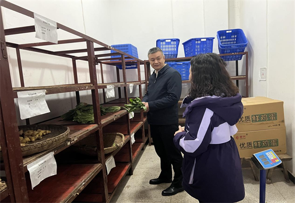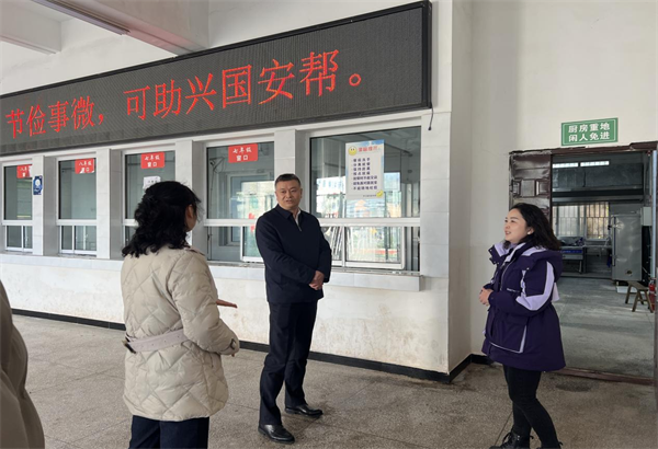 局长一行刚踏入校园,便被学校的校园环境所吸引,称赞学校新建校门外观漂亮大气,校园环境优美。随后,学校副书记唐甜甜就食堂管理、校园环境、生源问题及师生比等基本情况做了详细汇报。程局长边走边看,边听边问,首先来到学校的食堂,详细了解了食堂的管理机制,食材采购价格、菜品制作流程以及学生就餐情况等。在实地查看过程中,程先君局长对食堂的环境条件和菜品质量给予了肯定,并强调学校要继续加强食品安全管理,确保学生的饮食健康和安全。