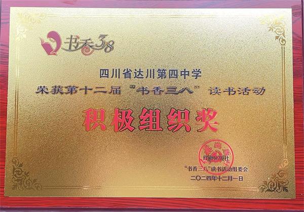 以“坚定文化自信·激扬奋进力量”为主题的第十二届“书香三八”读书活动于2023年12月1日在北京启动。在主办单位和支持单位的共同努力下,在全国各地工会、妇女组织、企事业单位、机关团体的大力支持下,活动圆满结束,取得了累累硕果。达川第四中学校工会在全国22000个单位中脱颖而出,获得“积极组织奖”。