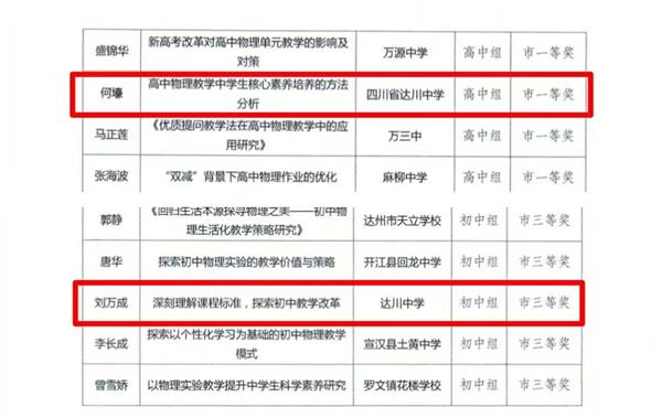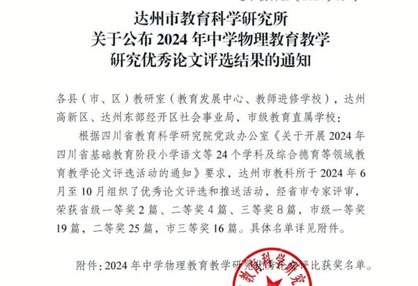 在达州市教育科学研究所公布的2024年中学物理教育教学研究优秀论文评选结果中,达川中学何豪老师的论文《高中物理教学中学生核心素养培养的方法分析》获得高中组一等奖;刘万成老师的论文《深刻理解课程标准,探索初中教学改革》获得初中组三等奖。