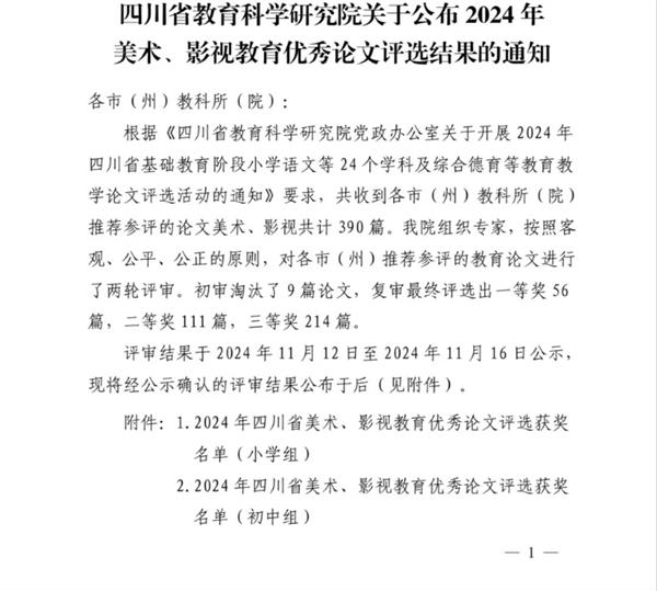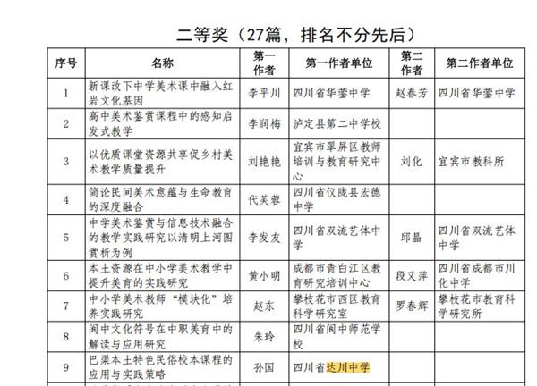 近日,在四川省教育科学研究院公布的2024年美术、影视教育优秀论文评选结果中,达川中学孙国老师的论文《巴渠本土特色民俗校本课程的应用与实践策略》荣获二等奖。