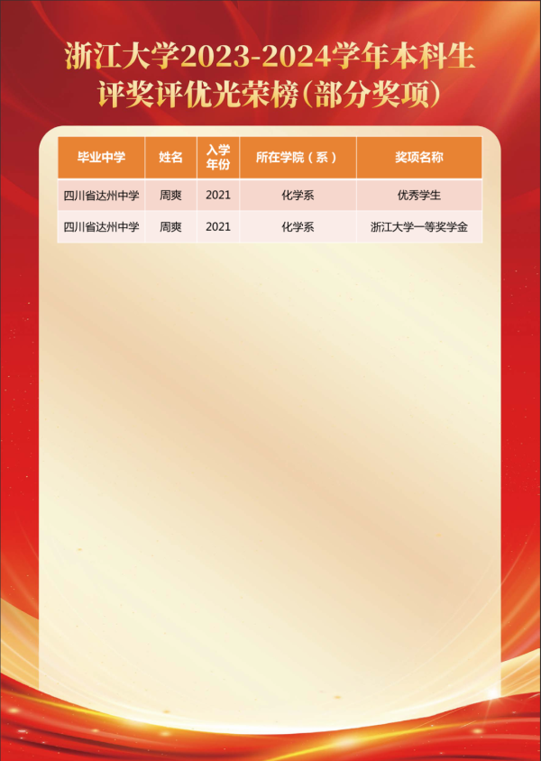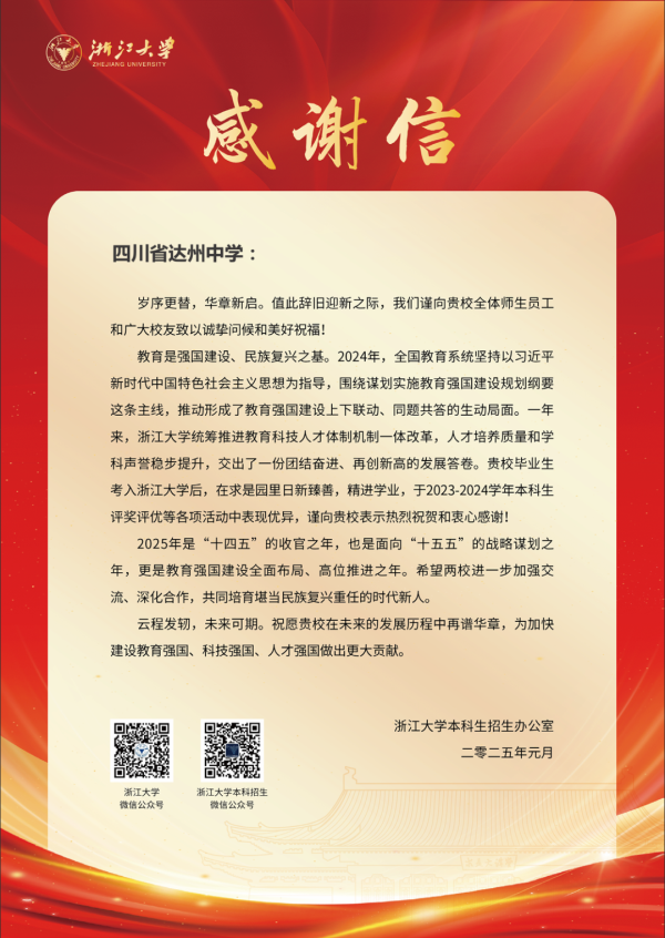【喜讯】浙江大学向四川省达州中学发来感谢信祥龙摆尾辞旧岁,金蛇翘首迎新春。新年伊始,浙江大学向四川省达州中学全体师生员工与广大校友致以最诚挚的问候和最美好的祝愿!祝贺达州中学2021级优秀学子周爽在浙江大学求学期间只争朝夕、不负韶华,取得了优异成绩,实现了卓越发展,是两校共同的荣誉和骄傲。 悉心培育栋梁,喜闻桃李芬芳。四川省达州中学将坚持为党育人、为国育才,助力更多学子放飞青春梦想,努力在教育发展新征程中作出更大贡献!(陈泓静) |