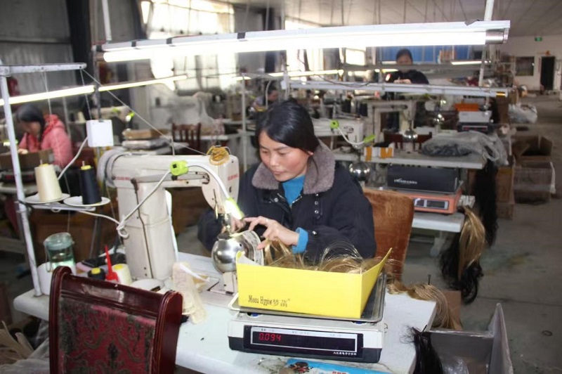 图为廉村镇东韩庄村铭基发制品厂的员工们正在赶制生产定订单。