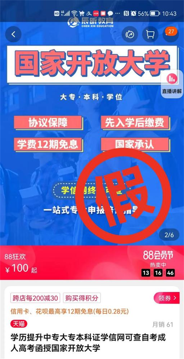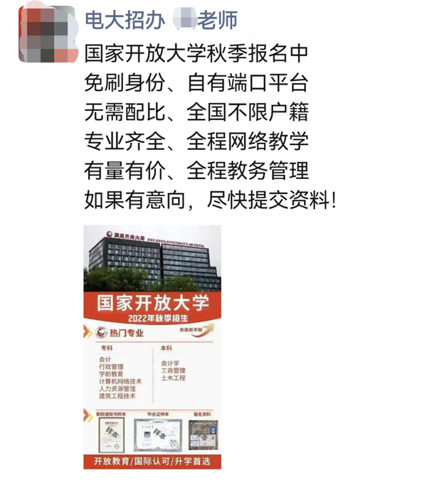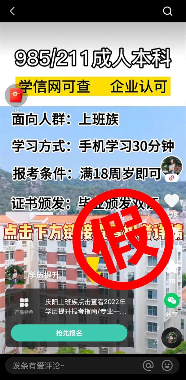 达州开放大学温馨提示——小心招生陷阱 常见招生骗局国家开放大学2022年秋季招生工作正如火如荼进行中,但国小招发现,社会上个别机构和个人假冒国家开放大学名义,通过电商和短视频平台、宣传单、微信、微博等各种渠道发布虚假招生宣传,如“国家开放大学入学无门槛”“在读期间无考试”“只要花钱,就能坐等毕业”…… 如今,骗子的手段可谓花样百出,他们甚至利用大数据精准“拿捏”大众痛处——部分人员渴求高学历、高文凭的焦虑心情和现实需求,谎称专家、在校人员等,虚假承诺、违规招生、骗取钱财。 在此,国小招提醒大家,一定要擦亮眼睛,切忌轻信虚假宣传! 为了戳穿那些招生骗局,本期,国小招化身“打假卫士”,逐一揭露存有“猫腻”的招生手段!请有报读计划的同学收好这份“避坑”指南,并广而告之~ 冒用开放大学办学体系名义招生 常见手段:声称自己为开放大学办学体系内正规学习中心等 有的中介机构对外宣传时,声称自己为国家开放大学直属,或分部、学院授权的正规学习中心或招生代理机构,工作人员称自己为国家开放大学招生老师。 虚假宣传、学历造假 有中介机构声称“报名即入学”“稳妥录取”“VIP通道”“入学无门槛”,甚至高调宣传包办入学,包给毕业证,并替学生伪造前置学历,骗取入学资格,让学生签署《入学协议书》,声称学信网可查询,可随时申请退款。 以上说法均为虚假宣传。 中介机构在发布的广告及宣传中声称“报名即入学”“稳妥录取”“VIP通道”“入学无门槛”,实际上是利用广大学子入学心切的心理,在承诺为学生办理入学的背后,实则利用学生提供的信息,为学生办理伪造的高中学历证书或其他前置学历材料,向学校提供伪造前置学历骗取入学资格。 这种使用伪造学历办理入学手续的情况均属于违反国家招生、学籍相关管理规定的行为。一经发现,学校将取消学生学籍,已毕业的学生取消获取的学历并追回颁发的毕业证书。不符合前置学历报名条件的学生在付出了金钱和时间后,因为轻信了中介的虚假宣传,要承担相应的处罚的同时,甚至很有可能错过考公、提拔等人生关键机会。 虚假承诺 常见手段:承诺“不学习、不考试拿证、毕业无忧、两年可毕业等” 一些中介机构向学生承诺“无平时作业”“学习考试不用管,由教务老师完成”“免考试”“无考试”“考试轻松、容易通过”“免上课”“不用学习”“代刷课时”“全程托管”“半托”“坐等毕业”“包过”等。 部分中介机构声称“两年学制”“两年可毕业”“两年半拿证”“保证两年半顺利毕业”,并承诺“在家躺着就能拿学历”“最轻松、最简单拿证”“毕业无忧”“稳妥毕业”。 这类说法均不属实,为虚假承诺。 国家开放大学是教育部直属的,以促进终身学习为使命、以现代信息技术为支撑、以“互联网+”为特征、面向全国开展开放教育的新型高等学校,对招生、教学、毕业考核等环节均有规范的管理和要求。以考试环节为例,国家开放大学组织开展纸质试卷考试及网络机考等,并使用人脸识别等技术手段严查替考、作弊等行为。我校专科起点本科专业、专科专业最低修业年限均为两年半,高中起点本科专业最低修业年限为五年。学籍有效期最长为八年,学生在学籍有效期内取得规定的毕业所需学分、符合毕业条件,才准予毕业并颁发国家开放大学毕业证书。 乱收、多收学费、报名渠道混乱 常见手段:学费造假 一些中介机构要求学生一次性缴清学费,或者提前收取学费、推销学费贷款等。有些随意划定学费标准,常见表述如“学费分期”“学费10800元”“学费最低5530元”“学费10551元,首次交4000,审核通过就注册学信网,交剩下一半”“先付定金975,待学信网上查到学籍后,再付6000元”……这些行为都潜藏着骗取学费、拿钱跑路的风险。 购物平台出售学历:一些中介机构利用现在网络购物平台发达,学生相信购物平台交易有保障等心理,在购物平台开设网店,公然出售包括国家开放大学在内的各高校学历。 中介往往使用一次性收取全部学费的形式,诱骗学生在查询到已在学信网查询学籍后,缴纳全部学费,并承诺“搞定考试等剩下环节,坐等拿证”,实则收取全部学费后,不久便失联跑路;或使用各种借口,声称因学校原因延期发证。 国家开放大学严格执行国家相关收费管理制度,按照所在地政府部门核定的收费标准和收费项目进行收费。不同层次和专业的费用有所区别,收费标准公开透明,请广大学生注意维护自身合法权益。 达州开放大学校从未通过淘宝、天猫、京东、闲鱼等购物平台投放过广告或提供报名渠道。请广大学生切勿相信中介机构在相关购物平台开设网店提供的信息及报名渠道。(来源:国家开放大学招生 国小招) |