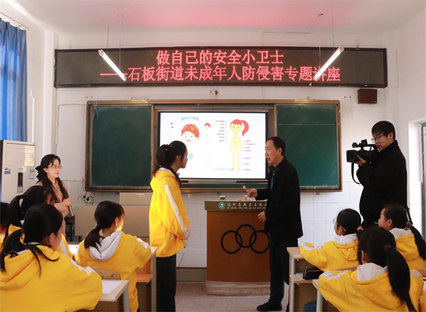 在活动中,学校邀请了石板街道办副主任张玉梅同志为部分学生开展了针对性较强的自我保护教育,其中包括防性侵害、网络诈骗、校园欺凌等方面的内容。张主任通过生动形象、深入浅出的预防未成年人受侵害知识讲解、模拟情景剧、角色扮演及学生现场互动问答,激发学生学习兴趣,让同学们很快掌握了自我保护的相关知识及防范要领。在张主任的引领下,全体学生举起右手,开展了庄严的“争做安全小卫士”宣誓仪式,将活动推向了高潮。