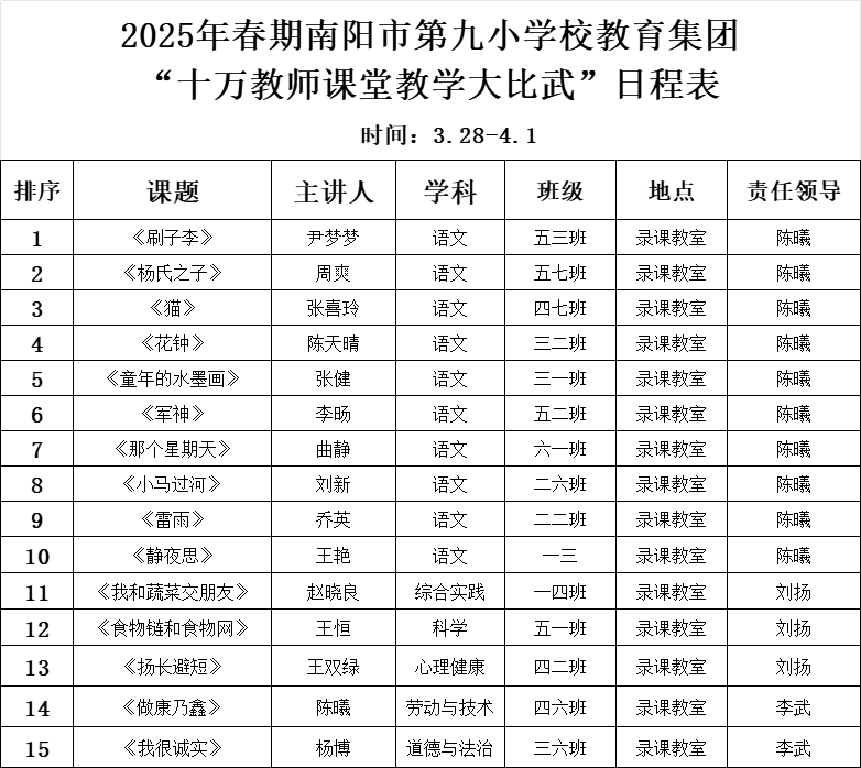深耕赛课沃土 厚植教育未来 教师课堂教学大比武活动纪实春风化雨润桃李,课堂研学聚力行。为了贯彻落实《南阳市“十万教师课堂教学大比武”活动实施方案》文件精神,深入推进课堂教学改革,提升教师业务水平和教学能力,提高学生核心素养,提升教育教学质量,南阳市第九小学校教育集团于2025年2月至4月,举办了为期一个半月的“教师课堂教学大比武”活动。 精筹密划 笃行致远 本次课堂教学大比武活动教师全员参与,分语文、道德与法治、科学、综合实践活动、心理健康、劳动与技术6个学科进行。从布局谋划到年级组比武、评课磨课,再到校级大比武,学校高标准落实好每一个细节,确保活动顺利开展。 此次活动共有15名教师在学科组比赛中脱颖而出,参加校级大比武的角逐。她们经过精心备课,认真钻研,反复推敲,凭借自己独特的教学风格、巧妙地利用现代信息化教学手段、新颖灵活的教学方法,将教学水平发挥到最佳状态,引导学生在轻松愉快的氛围中进行自主探究学习,呈现出了异彩纷呈的课堂。 妙彩频呈 竞展其长 语 文 文以载道 语启新思 尹梦梦老师 《刷子李》 周爽老师 《杨氏之子》 张喜玲老师 《猫》 陈天晴老师 《花钟》 张健老师 《童年的水墨画》 李旸老师 《军神》 曲静老师 《那个星期天》 刘新老师 《小马过河》 乔英老师 《雷雨》 王艳老师 《静夜思》 道德与法治 德法并育 启智润心 杨博老师 《我很诚实》 综合实践活动 实践探究 知行合一 赵晓良老师 《我和蔬菜交朋友》 科 学 科学探究 走近自然 王恒老师 《食物链和食物网》 心理健康 心灵之旅 正视自我 王双绿老师 《扬长避短》 劳动与技术 劳技育人 妙手生花 陈曦老师 《做康乃馨》 竞赛搭桥 听评赋能 王晓东校长深入课堂听课指导 水玉副校长课后点评总结 教乃研之基础,研乃教之利器。评课环节,水玉副校长和教导处陈曦主任紧扣课标对每节课进行了方向性的指导,并提出了详细的意见和建议,使老师们获益匪浅。老师们也围绕如何有效落实教学目标,积极献言献策,从教学方法的优化,到教学内容的取舍,从课堂互动的提升,到学生思维的启发,每一条建议都饱含着对教学精益求精的孜孜追求。 心怀远景 勇毅前行 深耕者,不畏泥土之厚;共研者,自成星火之光。九小教师正以坚实的脚步,书写学科育人的崭新篇章。相信全体教师将以此次课堂教学大比武活动为契机,做“学习型”“创新型”教育者,让每一堂课都成为学生拔节生长的沃土。 南阳市第九小学校教育集团将持续以教研为抓手,以创新为引擎,在深化课程改革的征途上勇毅前行,为培育“有理想、有本领、有担当"的时代新人贡献卓越力量! |