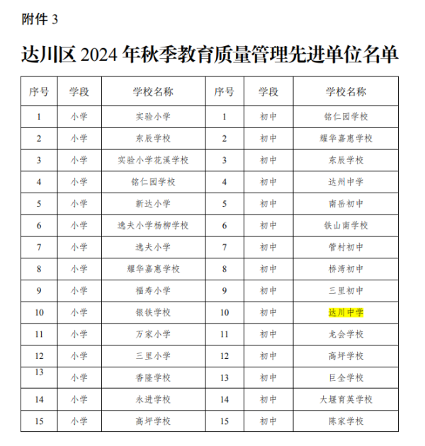 喜报!达川中学五位老师荣获教育质量先进个人称号近日,达川区教育局公布2024年秋季教育质量先进个人评选结果,达川中学程艳、张莉、陈燕、陈娜、何梅五位老师以卓越的专业素养、优异的教学实绩和赤诚的教育情怀荣获“教育质量先进个人”称号,达川中学获评教育质量管理先进单位。