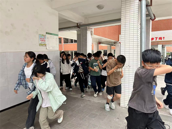 随着消防警报声响起,演练正式开始。全体师生迅速反应,各班主任、任课教师迅速到岗,指导学生用手捂住口鼻,弯腰前行,按照预先规划逃生路线,快速且有序撤离至操场安全区域。整个过程紧张有序,仅用时3分钟,全体师生安全疏散完毕。