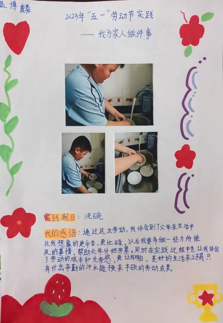 南阳市姜营小学开展2025年五一国际劳动节活动劳动是生活的基础,是幸福的源泉,更是每个人走向成功和辉煌的唯一途径。在2025年国际劳动节来临之际,南阳市姜营小学积极践行劳动教育理念,各年级开展了丰富多彩的劳动实践活动,让同学们在劳动中收获成长与快乐。 一年级举办的“小小劳动能手”手工制作活动妙趣横生。彩泥、卡纸在孩子们手中摇身一变,成了栩栩如生的小扫把、精致可爱的小水壶。他们用稚嫩的小手,勾勒出对劳动工具的认知,在动手实践中开启劳动启蒙之旅。 家务劳动大比拼 二年级的“家务劳动大比拼”将劳动课堂延伸到家庭。清洗餐具、叠放衣物、打扫房间,同学们化身家务小达人,用视频记录下劳动的精彩瞬间。在班级评比中,大家相互学习,体会到父母操持家务的辛劳,学会了责任与担当。 节后各班老师及时总结,反馈,颁奖。小小的奖励让孩子们的干劲更足了! 校园环保小卫士 三年级的“校园环保小卫士”行动如火如荼。同学们分组行动,不放过校园任何一个卫生死角,还精心呵护校园植物,浇水施肥。 活动后,一篇篇简短的环保劳动心得,承载着他们对校园环境的爱护之情,也让环保理念扎根心中。 四年级“我为家人做件事”活动温暖人心。为家人捶背、盛饭、整理衣物,一个个温馨的瞬间被定格在A4纸上。照片下的心情描述,字里行间满是对家人的爱,在劳动中学会感恩,传递温暖。 五年级的“变废为宝”创意劳动,让废旧物品焕发新生。饮料瓶成了美丽的花瓶,旧衣物化作实用的收纳袋。班级展览上,一件件创意十足的作品令人赞叹,同学们不仅锻炼了动手能力,更懂得了节约资源、循环利用的意义。 六年级的“职业体验初探索”活动,为同学们打开了一扇了解社会的窗户。通过采访劳动者和亲身职业体验,他们感受到不同职业的艰辛与价值。一篇篇体验报告,是他们对未来的思考,也是对劳动者的致敬。 劳动教育,如同一颗种子,在同学们心中生根发芽。相信通过这些丰富多彩的劳动实践活动,同学们不仅培养了劳动技能,更收获了美德与成长,未来定能用勤劳的双手创造更加美好的生活! |