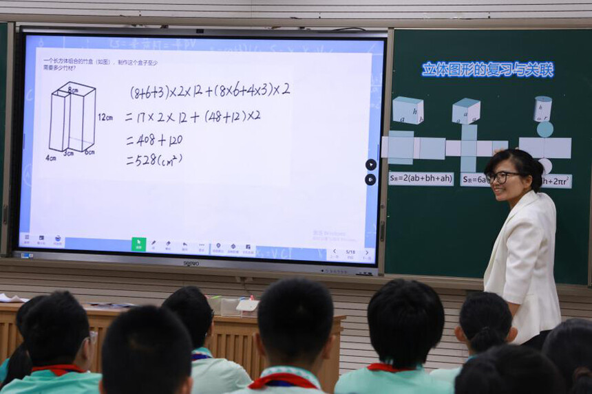 何君红老师带来精彩的课例展示——《立体图形的复习与关联》。她从教学设计到课例展示,借循证课堂与AI数字报告改进课堂问答行为,调整教师行为与学生行为在课堂中的时间占比,精准改课,推动课堂教学从“经验驱动”迈向“数据驱动”的转变,悠然地画出了一幅好课的画像。