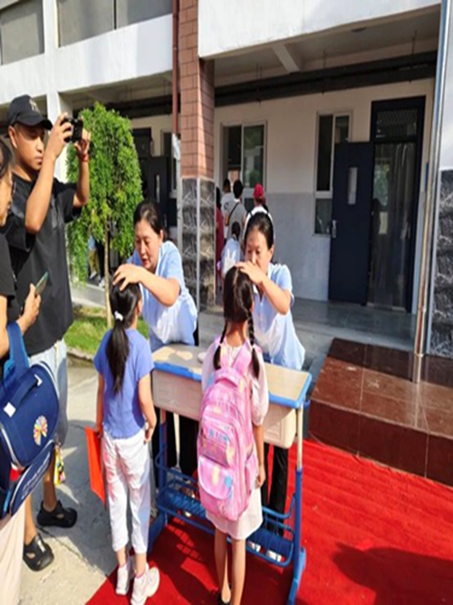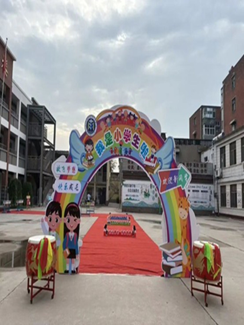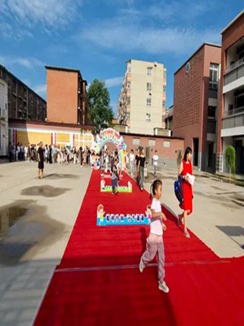启智拱门:一步跨越,开启校园新篇 色彩斑斓的卡通拱门矗立在教学楼前,像一道通往知识乐园的彩虹。家长们牵着孩子的手,缓缓穿过拱门,快门声定格下这一珍贵瞬间——从这一刻起,这些曾经的幼儿园小朋友,正式成为南关小学的一员。拱门两侧,老师们温柔的笑容与掌声,是送给孩子们最温暖的“入学礼”。 红毯跨栏:步步向前,解锁成长密码 鲜红的地毯延伸至教学楼,仿佛一条通往成长的“星光大道”。地毯上三个卡通造型的跨栏格外吸睛:跨栏上写着“状元跨栏,所向披靡”“聪明伶俐,元气满满”,“健康成长,平安喜乐”。孩子们在老师的引导下,一个个跃过跨栏,小小的身影里,藏着对未来的无限向往——这不仅是肢体的跨越,更是对“勇敢”“向上”的第一次实践。