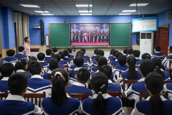 09:00阅兵式正式开始,全校师生以班级为单位,全程收看北京天安门广场举行的阅兵仪式。当国旗护卫队迈着铿锵步伐入场、新型武器装备依次亮相时,现场响起阵阵掌声。九(2)班学生夏子沫激动地说:“歼-20战机编队掠过天空的瞬间,我感受到了祖国的强大。作为新时代青年,我们更要珍惜来之不易的和平。”