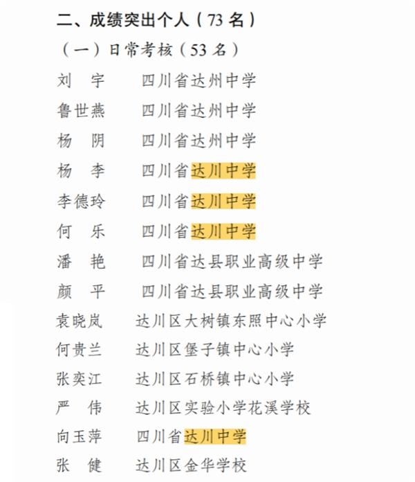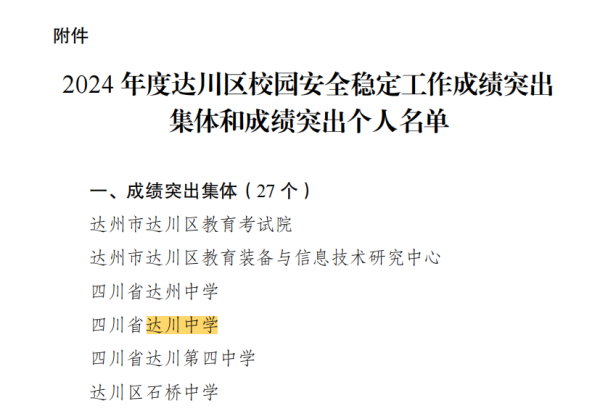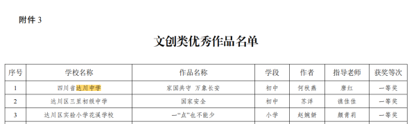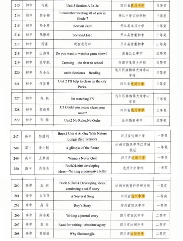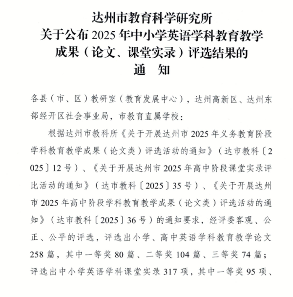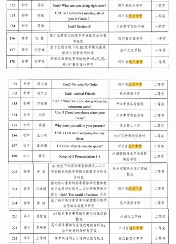 祝贺!川中师生在各项评选中喜获佳绩奋楫扬帆,喜讯连连。在这个充满喜悦和收获的季节里,川中师生凭借扎实的知识、出色的技能和顽强的拼搏精神,在各项评选活动中取得喜人成绩。 近日,达州市达川区教育局公布《关于表扬2024年度达川区校园安全稳定工作成绩突出集体和个人的通报》。四川省达川中学获评“成绩突出集体”,杨李、李德玲、何乐、向玉萍4名教师获评“成绩突出个人”。 在达州市达川区教育局公布的关于2025年全民国家安全系列作品征集评选活动获奖情况中,达川中学彭军、刘萍萍两位老师的微课作品荣获二等奖。唐红老师指导何秋燕同学文创作品荣获一等奖。 在达州市教育教育科学研究所先后公布的2025年中小学英语学科教育教学成果(论文、课堂实录)评选结果,以及2025年初中化学、生物学科优秀论文评选结果中,达川中学共有15位老师获奖。其中,英语学科获得4个一等奖、5个二等奖、3个三等奖;化学学科获得1个二等奖;生物学科获得1个二等奖、1个三等奖。 祝贺以上获奖师生! 聚师生向上之力,扬川中奋进之帆。在奋力建设教育教学高质量发展的道路上,达川中学将聚力致远,笃行不怠!(来源:四川省达川中学 杨丹) |