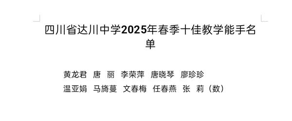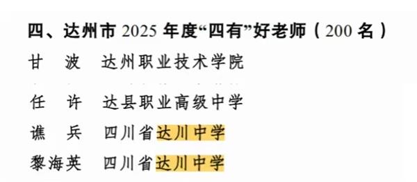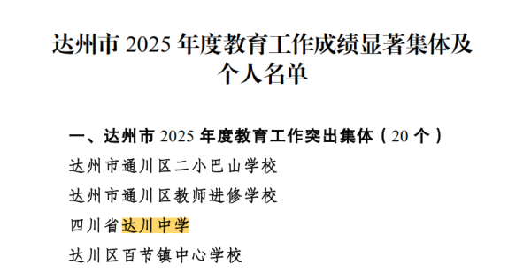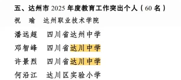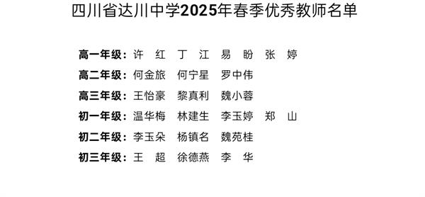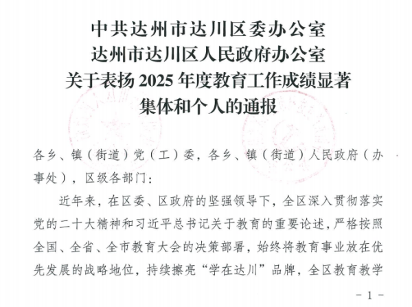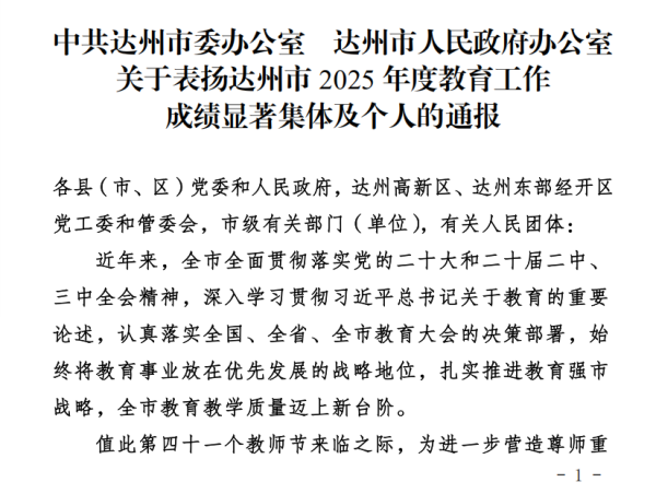 这些表扬不仅是对获奖教师个人业绩的肯定,更是对全校教育教学工作的鞭策与激励。达川中学将继续营造尊师重教、争先创优的良好氛围,努力打造高素质专业化教师队伍,为持续推进“学在达川”教育品牌、培养更多优秀人才贡献力量!(来源:四川省达川中学 杨丹)