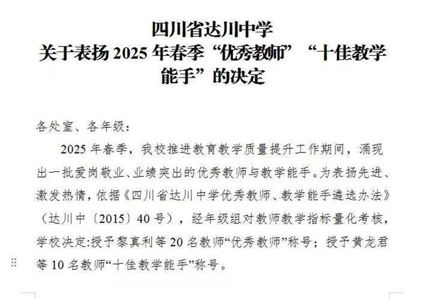 根据中共达州市委办公室《达州市人民政府办公室关于表扬达州市2025年度教育工作成绩显著集体及个人的通报》及中共达州市达川区委办公室《达川区人民政府办公室关于表扬2025年度教育工作成绩显著集体和个人的通报》,达川中学52名教师获市级、区级荣誉。同时,依据《四川省达川中学优秀教师、教学能手遴选办法》,经严格考评,学校授予黎真利等20名教师“优秀教师”称号,黄龙君等10名教师“十佳教学能手”称号。