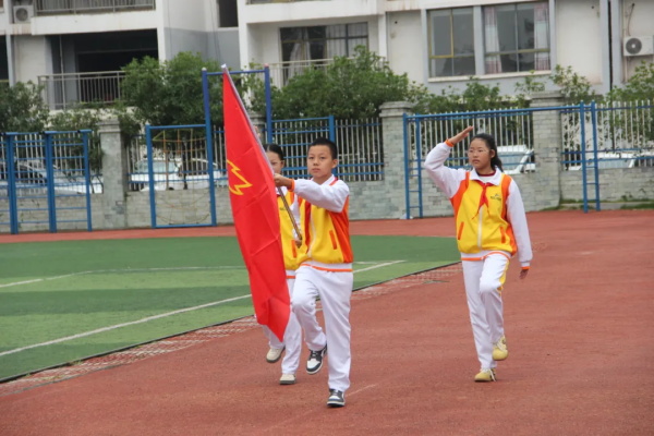 一面鲜艳的中国少年先锋队队旗,在三位队旗手的护卫下,迈着整齐有力的步伐缓缓入场。全体师生面向队旗,行注目礼,眼神中充满了崇敬与期待,现场气氛庄重而热烈。