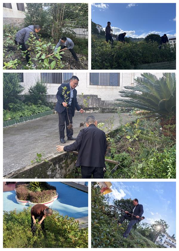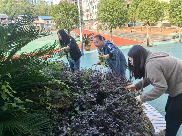 本次劳动聚焦校园公共区域改造,大家手持扫帚、锄头、镰刀等工具,有的埋头移栽树苗,有的弯腰拔除杂草,有的踮脚修剪参差不齐的枝丫,有的细致捡拾散落的树枝。通过两个多小时的辛勤付出,一些空坝子添了新绿,花坛里的杂草一律被清走,高矮不一的植物整齐划一,枯枝败叶一扫而光,整个校园焕然一新。