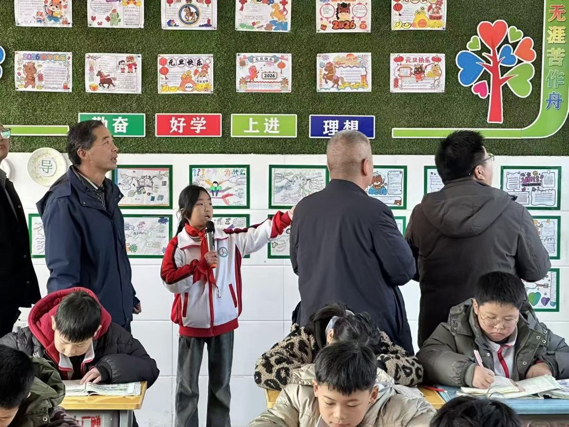 一、始于细节,成于格局:一次站位高远的“把脉问诊”。 王局长一到学校,便驻足校门之外。他细致察看周边环境,从一草一木的修整到整体氛围的营造,提出了立足乡土、兼具美育的优化建议。这看似细微的切入点,实则关乎教育的第一印象与文化熏陶的起点,彰显了检查组立足细节、着眼全局的高站位与深情怀。 随后,四名佩戴红领巾的校园宣传员,以稚嫩却自信的嗓音,引领检查组漫步校园。从“老师墨宝墙”、“学生书写展示廊”,到整洁明亮、充满生机的四年级教室,再到墨香流淌、静谧专注的书法教室,……检查组一路倾听,一路观察,目光中既有严谨的审视,更有温暖的期待。在书法教室,陈立军校长围绕学校概况、特色办学、教学与学生管理作了系统汇报。检查组随后兵分四路,深入校园各个角落,展开了一场任务重、覆盖广、要求严的全面体检。他们看得细、问得深、查得实,这份认真与负责,不仅是对学校工作的督导,更是对乡村教育高质量发展的深切助推。