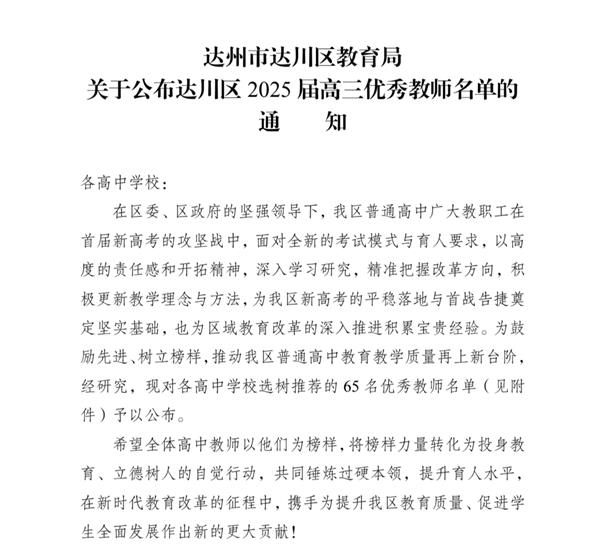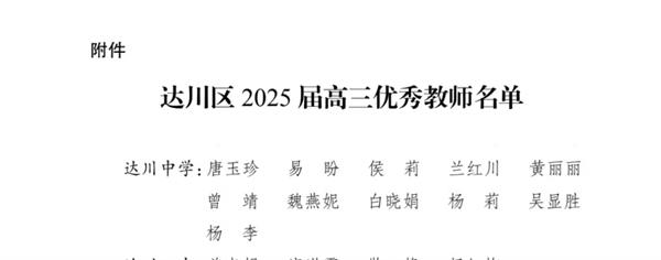 近日,达州市达川区教育局公布了“达川区2025届高三优秀教师”名单,四川省达川中学共有11位教师喜获表扬。