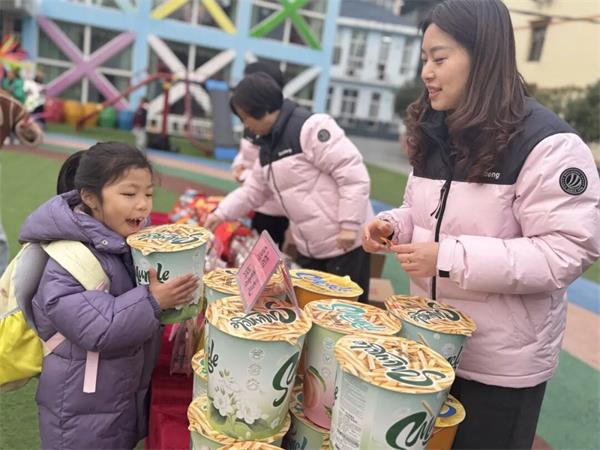 操场“迎新预热区”率先沸腾:红布桌案上,金灿灿的金蛋整齐排开,孩子们攥着系有红丝带的迷你小锤,踮脚瞄准、用力挥落——“咔嚓”声中,彩屑纷飞,“新年礼品兑换券”随之到手。孩子们捧着兑换来的礼物开心极了。