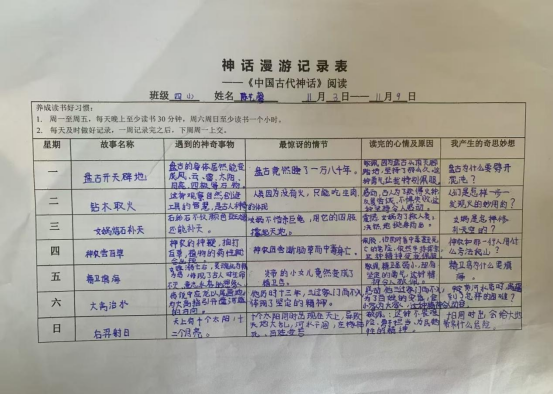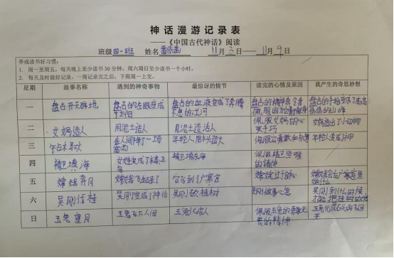 一、初遇神话:用记录捕捉第一缕光 阅读的起点,是孩子们与神话的初见。他们带着“探险”的心情,用最朴素的记录留住最初的感动与好奇——《神话漫游记录表》里,每一天都藏着新发现,零散的记录像一颗颗种子,埋下了探索的伏笔。雷依菡在表中记下盘古开天辟地时“左眼变成太阳、血液化作江河”的神奇,为女娲“用泥土造人”的灵巧心生敬佩;陈艺馨则对“盘古睡了一万八十年”的情节倍感惊讶,在钻木取火的故事里,为古人“不惧失败、观察自然的智慧”深深感动。