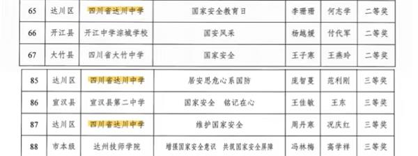 在达州市教育局关于公布国家安全宣传教育活动获奖名单中,达川中学学子表现优异:主题征文类作品荣获二等奖5件、三等奖2件;海报创作类作品荣获二等奖1件、三等奖2件。同学们通过文字和艺术创作,表达了对国家安全的理解与维护之志,展现了新时代青少年心系家国、勇于担当的精神风貌。