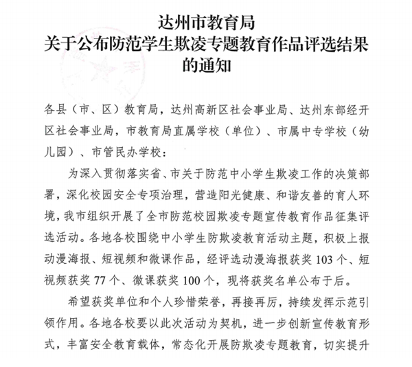 在达州市教育局公布的关于防范学生欺凌专题教育作品评选结果中,达川中学师生积极参与、精心创作,报送的多件作品获奖。其中,动漫作品荣获三等奖1件,微课作品荣获三等奖3件。这些作品围绕防范学生欺凌主题,以生动形象的方式传递了反对欺凌、共建和谐校园的理念,体现了达川中学在促进学生身心健康、营造安全育人环境方面的扎实工作。 每一项荣誉的背后,都凝聚着同学们的认真投入和老师们的悉心指导,更是学校坚持“五育并举”、落实立德树人根本任务的生动体现。 特此向所有获奖同学和指导老师表示热烈祝贺!期待全体师生再接再厉,继续以创作传递正能量,以行动践行社会主义核心价值观,共同推动校园文化建设再上新台阶!(来源:四川省达川中学 杨丹) |