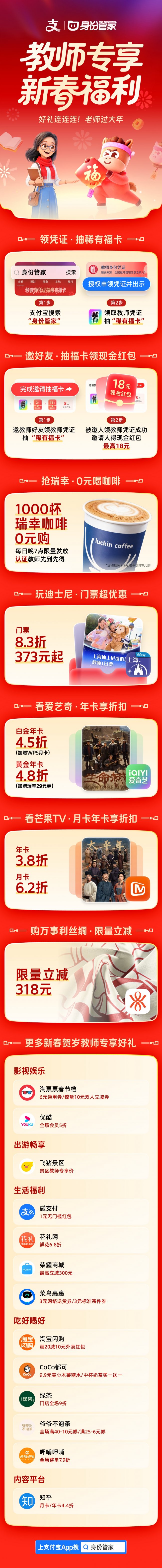 支付宝集福活动推出教师专享活动 :“身份管家”助力数字时代身份认证时间:2026-02-06 2026年农历新春前夕,支付宝“身份管家”平台联合众多商业品牌,在集福活动中践行“尊师惠师”公益理念,通过数字化方式为全国教师提供专属的新春福利,探索社会力量参与尊师重教的新路径。 据悉,本次教师专享活动与支付宝集福活动同步进行。全国在职教师只需在支付宝App内搜索“身份管家”,完成教师身份验证并领取专属数字凭证即可参与。 领取凭证后,有机会抽取平台提供的限量稀有福卡及现金红包;此外,包括迪士尼、瑞幸、淘票票、淘宝闪购、飞猪、万事利、爱奇艺、绿茶、希沃等商户品牌,为教师群体提供涵盖文旅、餐饮、购物、娱乐、学习等多方面的专属折扣与礼遇,将教师优待延伸至更广泛的日常生活消费场景。 该活动基于支付宝“身份管家”平台提供的数字身份解决方案,平台致力于在保障用户隐私与数据安全的前提下,建立可信、高效的数字身份认证与管理体系。 对教师来说,通过在线快速完成身份认证,可获得一个由用户自主可控的数字身份凭证。该凭证采用IIFAA分布式可信认证技术,全程保护用户隐私。用户无需上传实体证件和填写资料,即可实现安全便捷的在线身份核验。此外,平台以“最小化披露”原则,确保按需披露最少必要信息以解锁相应的专属权益,实现了用户在身份信息使用过程中的自主可控。此举将传统的身份证明,转化为可便捷兑现各类社会优待与服务的数字钥匙。 分析认为,此次活动,是互联网平台利用数字技术,聚合社会资源、拓展教师优待应用场景的一次具体实践。 蚂蚁集团大安全事业群副总裁邵晓东表示,未来支付宝将持续深化分布式可信认证的技术迭代与推广,推动数字身份从“证明你是谁”迈向“能为你做什么”,为构建安全、可信、有温度的数字社会提供坚实支撑。“你的身份,‘证’好有用。”这不仅是身份管家的品牌slogan,更是智能时代数字信任的新起点。