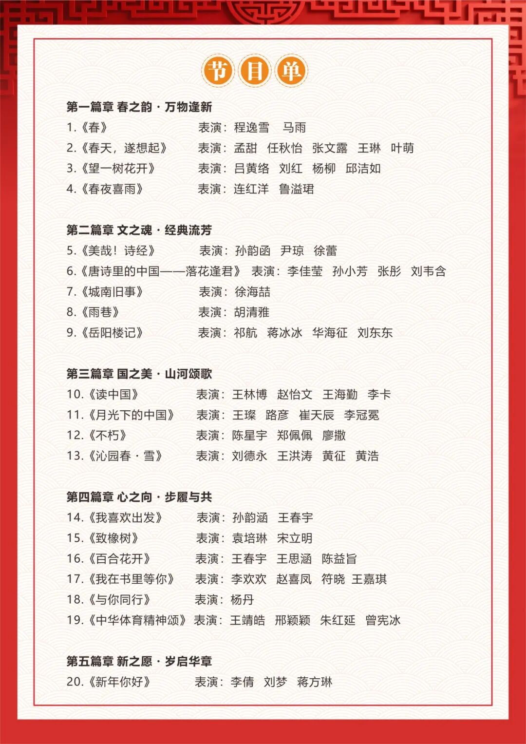 本次新春诗会以“诗意人生 向美而行”为主题,共分为“春之韵·万物逢新”“文之魂·经典流芳”“国之美·山河颂歌”“心之向·步履与共”“新之愿·岁启华章”五大篇章,20首经典诗歌美文依次在舞台上唯美呈现,或咏春景、诵经典,或颂山河、抒初心,或寄新愿、展未来,字字铿锵,句句深情,将教师们对生活的热爱、对经典的敬仰、对教育的坚守、对祖国的深情融入每一段朗诵中。