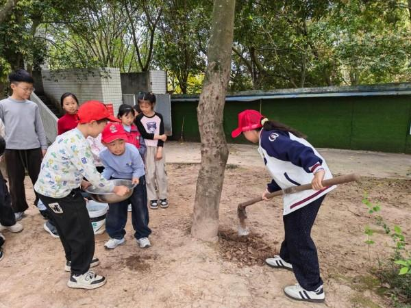 活动现场,孩子们头戴红帽,分工协作:有的手持铁锹为树苗松土,有的提桶浇水,稚嫩的小手捧着水盆,小心翼翼地将清水浇灌在树根旁,还有的两人合力抬水。个个干劲十足,动作规范而认真,欢声笑语回荡在校园。