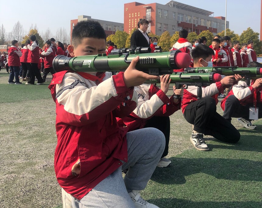 学习完国防知识,小记者们迎来了最期待的实践环节。冲锋枪、火箭筒、迫击炮等模型整整齐齐地排列在操场上,看到这些在电视上才见过的“武器”,小记者们一个个跃跃欲试。
