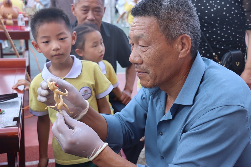记者在活动现场看到,11位非遗传承人带领孩子们制作面塑、南阳邓瓷、剪纸、传拓、中华书法、糖画、糖人、烙面、刺绣、南阳草编、南阳麻花技艺,孩子们纷纷驻足观看,亲手模仿,好一派热闹景象。